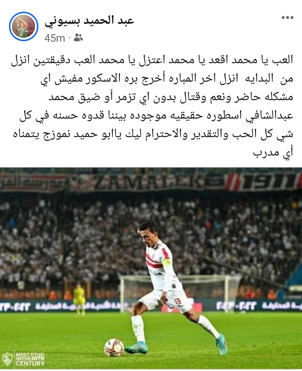 وتابع: محمد عبد الشافي أسطورة حقيقية موجودة بيننا، قدوة حسنة في كل شيء، كل الحب والتقدير والاحترام ليك يا أبو حميد نموذج يتمناه أي مدرب.