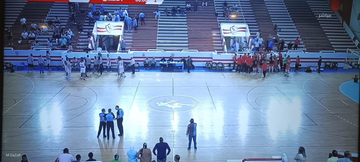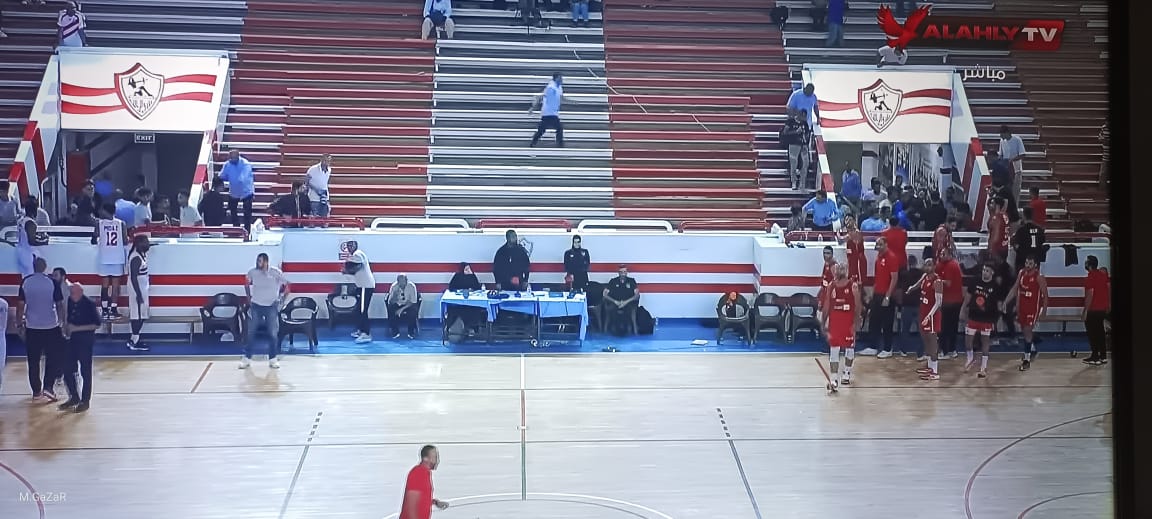 في المقابل، أجرى لاعبي فريق السلة بنادي الأهلي والزمالك إحماء في ملعب المباراة خلال التوقف على أمل عودة لقاء واستئنافه