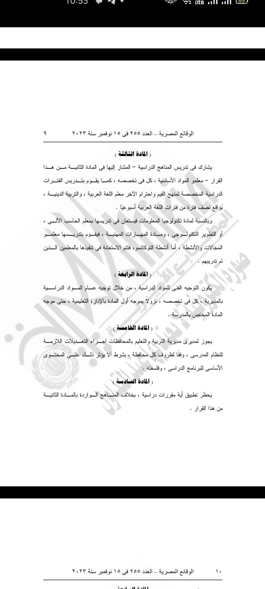 وأكدت المادة الخامسة أنه يجوز لمديري مديرية التربية والتعليم بالمحافظات إجراء التعديلات اللازمة للنظام المدرسي، وفقا لظروف كل محافظة، بشرط ألا يؤثر ذلك على المحتوى الأساسي للبرنامج الدراسي، وفلسفته، كما أكد القرار أنه يحظر تطبيق أية مقررات دراسية بخلاف المناهج الواردة بهذا القرار.