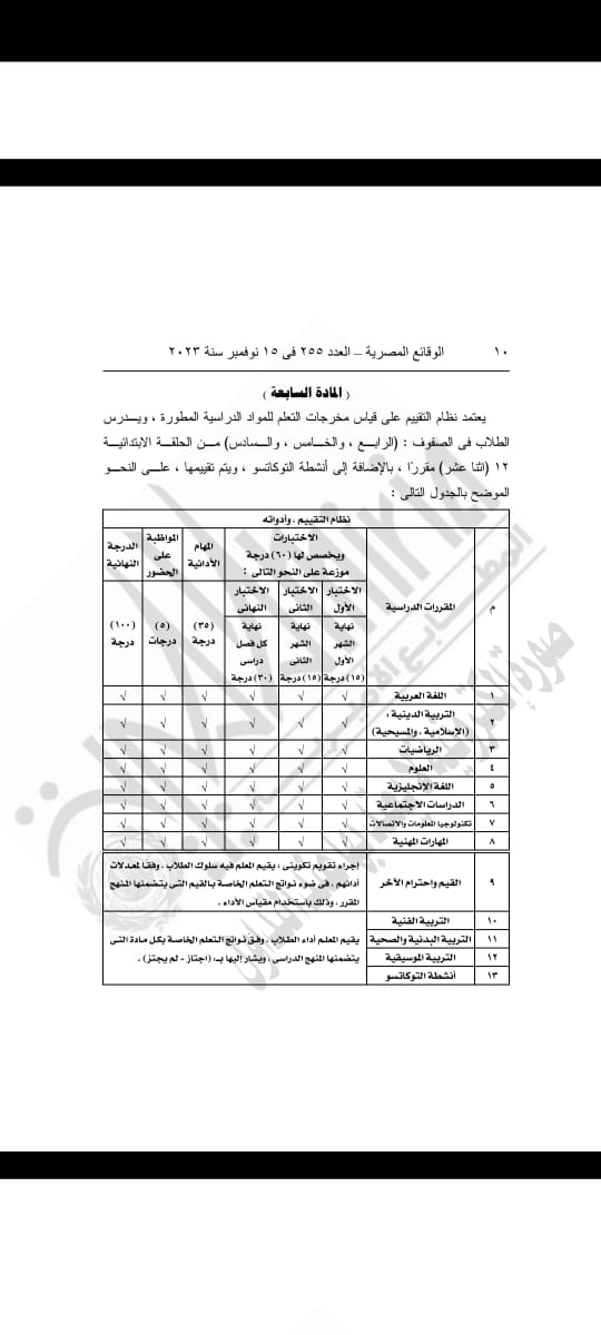 ونص القرار: على أن يعتمد نظام التقييم على قياس مخرجات التعلم للمواد الدراسية المطورة، ويدرس الطلاب في الصفوف الرابع والخامس والسادس من الحلقة الابتدائية (12) مقررًا، بالإضافة إلى أنشطة التوكاتسو ويتم تقييمها على النحو التالي: بالنسبة للاختبارات، فهي تنقسم إلى ثلاثة اختبارات في الفصل الدراسي الواحد، الاختبار الأول يستهدف أجزاء المقرر التي تم تدريسها في الشهر الأول، ويقيس نواتج التعلم المستهدفة في تلك الفترة الزمنية فقط، أما الاختبار الثاني فيستهدف أجزاء المقرر التي تم تدريسها في الشهر الثاني ويقيس نواتج التعلم المستهدفة في تلك الفترة الزمنية، ويخصص لعقد كل اختبار من الاختبارين السابقين فترة دراسية واحدة، ويتم ذلك تحت ملاحظة المعلم في الأسبوع الأخير من الشهر، أما الاختبار النهائي فيعقد في نهاية كل فصل دراسي ويقيس نواتج التعلم المستهدفة في الفصل الدراسي كاملا، ويحصل الطالب في نهاية الفصل الدراسي على مجموع الدرجات الثلاث.