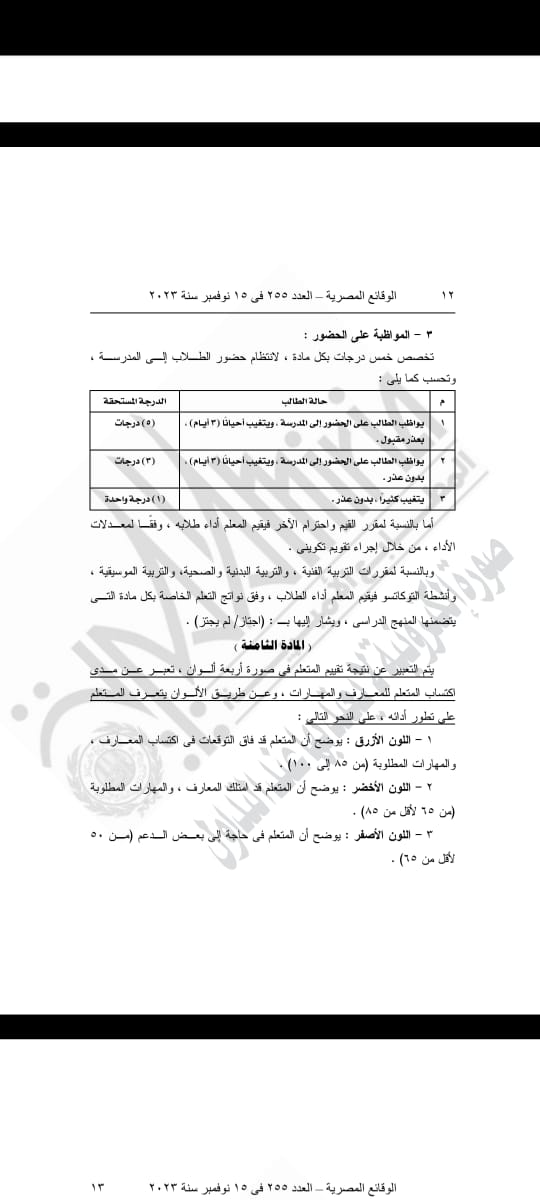 أما فيما يتعلق بالمواظبة على الحضور، فقد أشار القرار إلى أنه تخصص خمس درجات بكل مادة لانتظام حضور الطلاب إلى المدرسة، وتحسب كالآتي: يستحق الطالب 5 درجات في حالة مواظبته على الحضور إلى المدرسة، وتغيبه أحيانا 3 أيام بعذر مقبول، ويستحق الطالب 3 درجات في حالة مواظبته على الحضور إلى المدرسة وتغيبه أحيانا بدون عذر، ويستحق الطالب درجة واحدة في حالة تغيبه كثيرًا بدون عذر.