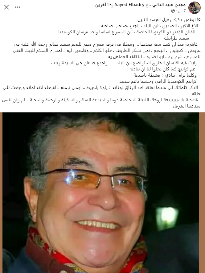 وتابع مجدي عبيد: كرابيچ الكوميديا الراقي، وحشتنا يا عم سعيد، أتذكر كلماتك لي، عندما نفتقد أحد الرفاق لوفاته، يا ولا يا عبيط، اوعي تزعله افرحله، لأنه أمانة ورجعت للي خلقه، قشطة يا سيعة لروحك النبيلة المخلصة دوما، والمبدعة السلام والسكينة والرحمة والمحبة.. لم ولن ننسى مبدعينا الشرفاء.