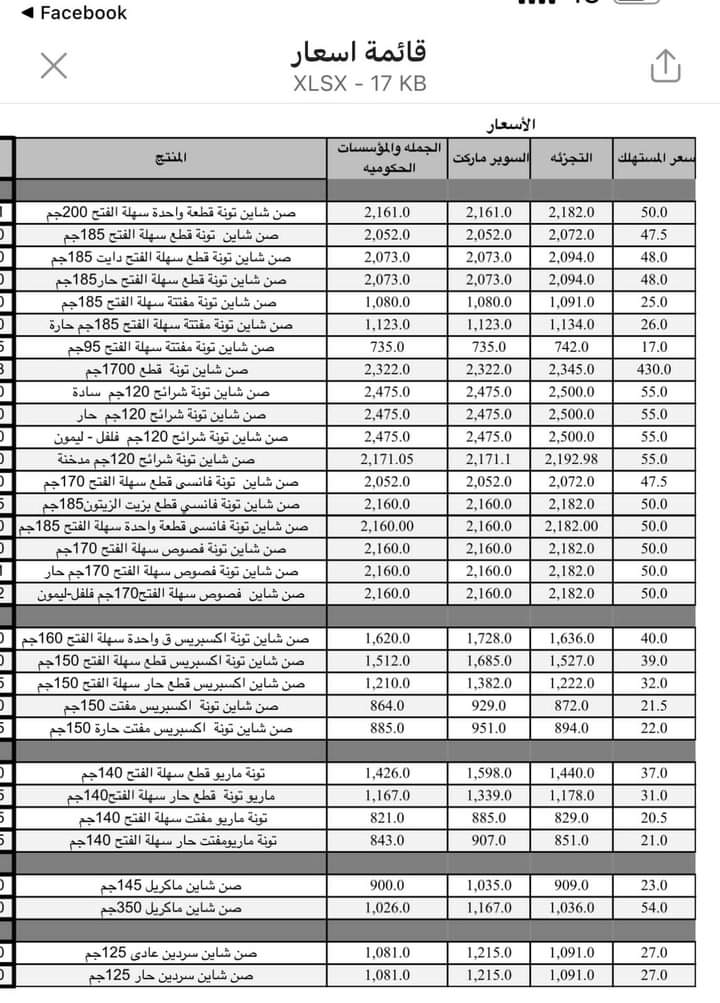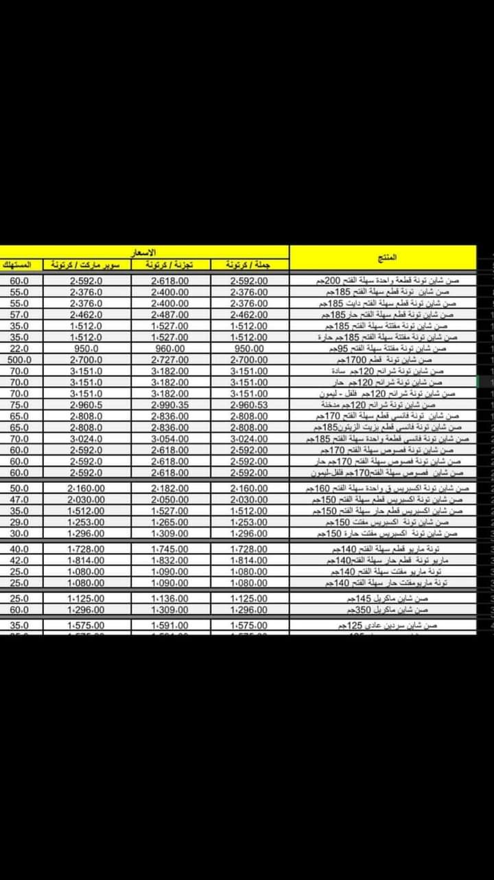 وحسب قائمة الأسعار المرسلة للتجار أعضاء الغرف التجارية والتجار، سجل سعر تونة صن شاين قطعة واحدة سهلة الفتح 200 جرام، نحو 60 جنيهًا، وسعر تونة صن شاين 185 جرامًا سهلة الفتح نحو 55 جنيها.