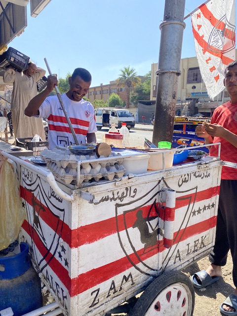 يقف بعربة فول بأحد شوارع الأقصر يرتدي قميص نادي الزمالك كما أن عربة الفول نفسها بالكامل بلون قميص وعلم وشعار النادي وكتب عليها مدرسة الفن والهندسة.