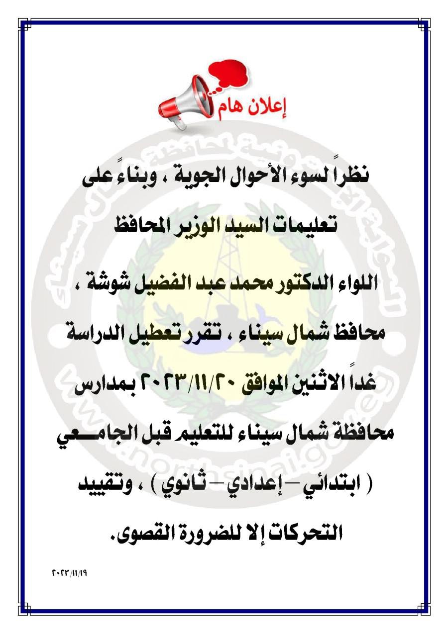 أصدر اللواء دكتور محمد عبد الفضيل شوشة، محافظ شمال سيناء، قرارا بتعطيل الدراسة في جميع مدارس المحافظة غدا الاثنين؛ نظرًا لسوء الأحوال الجوية، وهطول أمطار غزيرة على مختلف مناطق المحافظة.