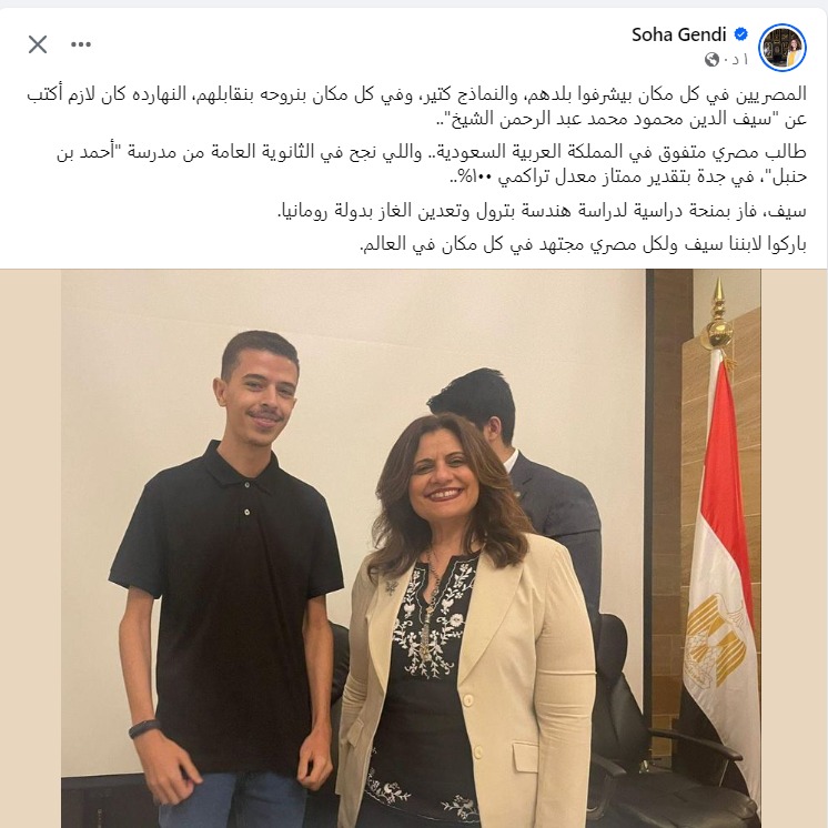 نشرت السفيرة سها جندي وزيرة الدولة للهجرة وشئون المصريين بالخارج، قصة نجاح طالب مصري بالسعودية يدعى سيف الدين محمود محمد عبد الرحمن الشيخ، قائلة إنه حصل على تقدير ممتاز معدل تراكمي 100%، بالثانوية العامة.