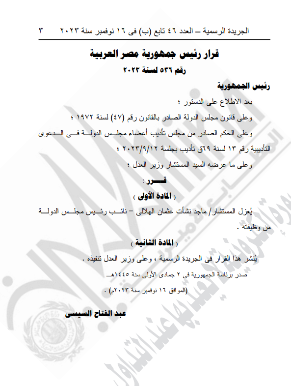 ونص قرار رئيس الجمهورية رقم 536 لسنة 2023 بعزل المستشار ماجد نشأت عثمان الهلالي، نائب رئيس مجلس الدولة من وظيفته.