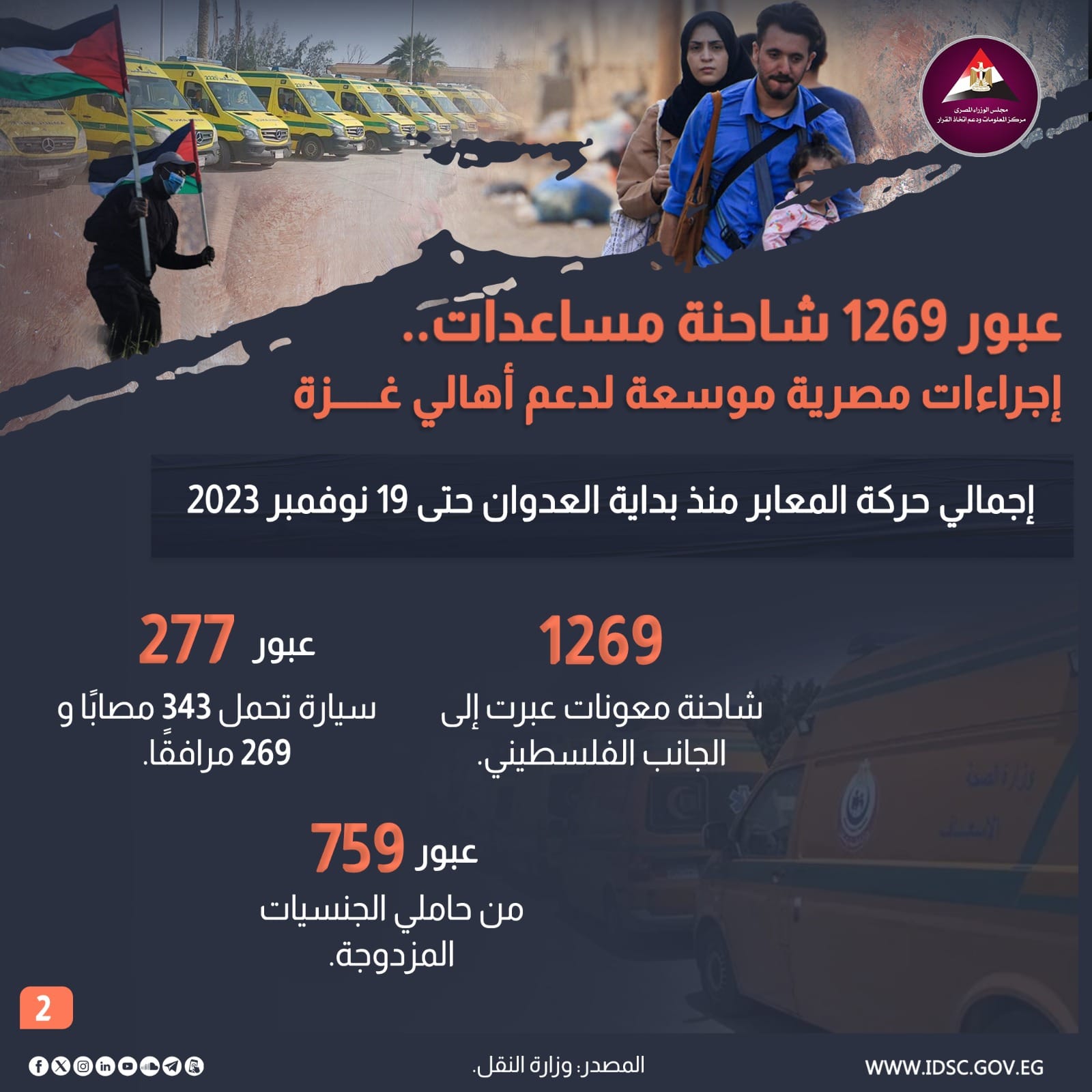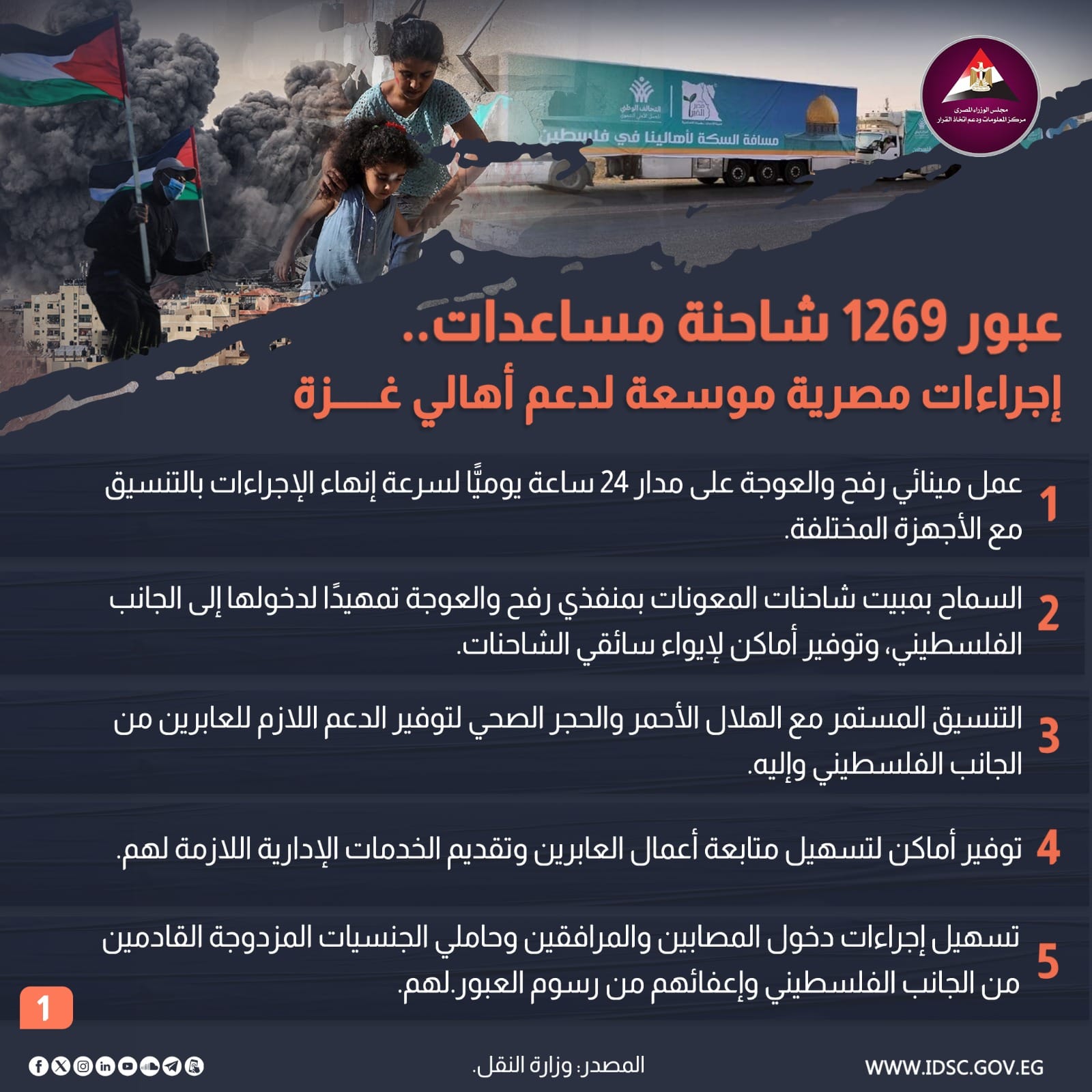 سلط مركز المعلومات ودعم اتخاذ القرار التابع لـ مجلس الوزراء الضوء على عبور 1269 شاحنة مساعدات، والإجراءات الموسعة التي اتخذتها الدولة لدعم أهالي غزة.