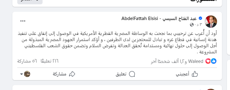 قال الرئيس عبد الفتاح السيسي إنه يود الإعراب عن عن ترحيبه بما نجحت فيه الوساطة المصرية القطرية الأمريكية في الوصول إلى اتفاق على تنفيذ هدنة إنسانية في قطاع غزة وتبادل للمحتجزين لدى الطرفين.