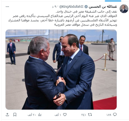 ملك الأردن: نقف إلى جانب مصر في خندق واحد.. وموقفنا مشترك بشأن التهجير