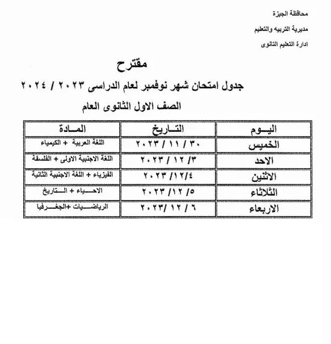 ننشر جدول امتحانات شهر نوفمبر 2023 للصف الأول الثانوي بالجيزة