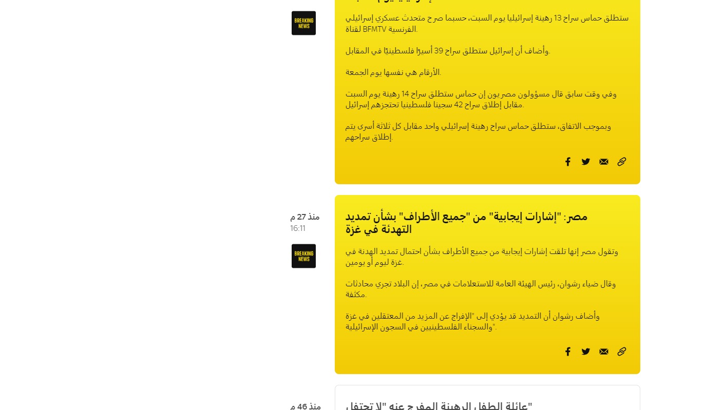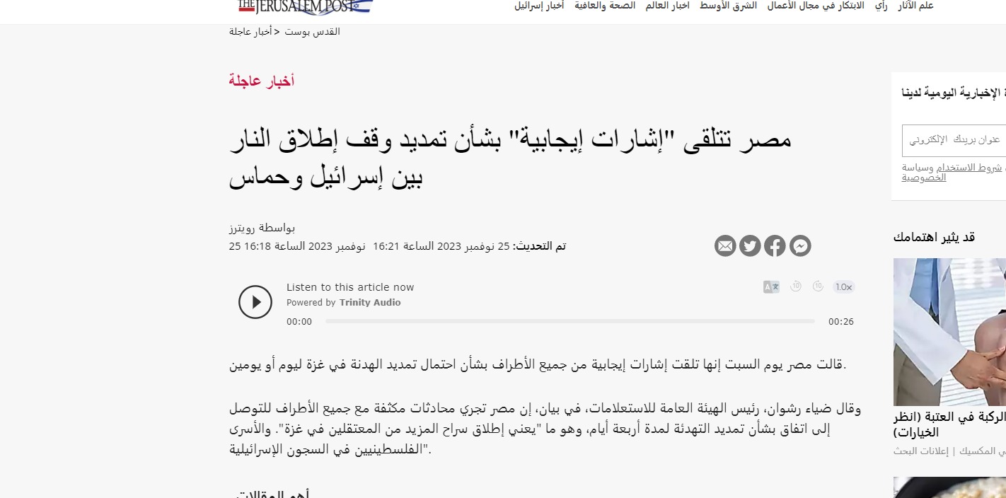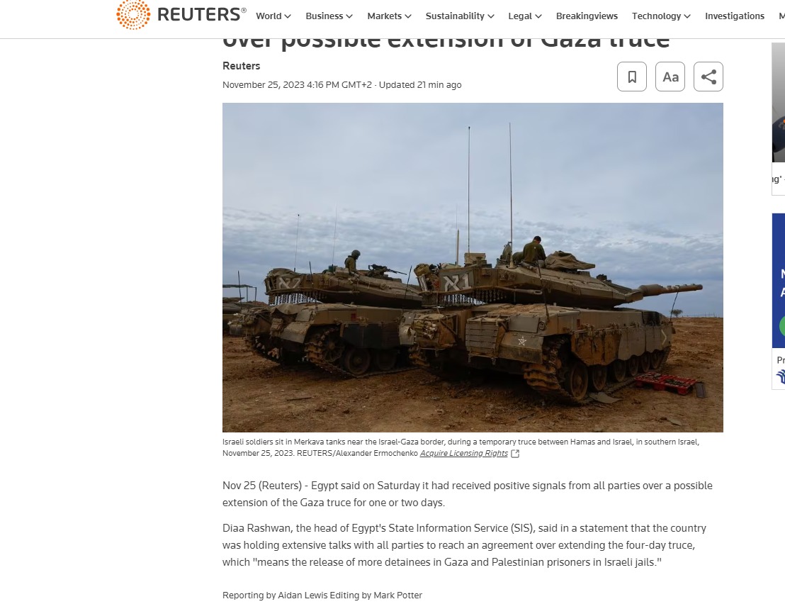 واليوم حرصت وسائل الإعلام الدولية على تناول بيان الهيئة العامة للاستعلامات بشأن اتصالات مصرية مكثفة تجري حاليا مع كل الأطراف، لتمديد فترة الهدنة بين الجانبين الإسرائيلي والفلسطيني، لمدة يوم أو يومين إضافيين، بما يعني الإفراج عن مزيد من من المحتجزين في غزة والأسرى الفلسطينيين في السجون الإسرائيلية.