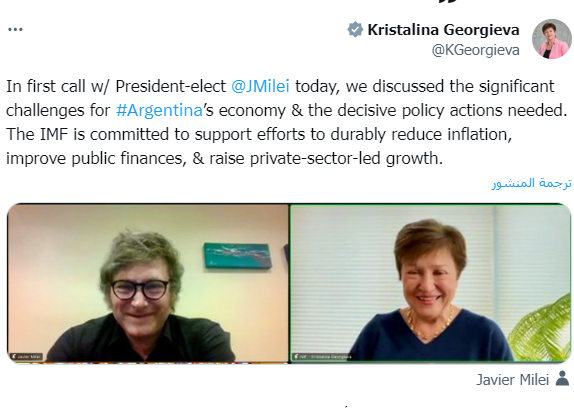 أجرت مديرة صندوق النقد الدولي كريستالينا جورجييفا، والرئيس الأرجنتيني المنتخب خافيير ميلي أول، أول اتصال هاتفي بينهما، لمناقشة اقتصاد البلاد وسط تضخم مكون من 3 أرقام وانخفاض للعملة المحلية.