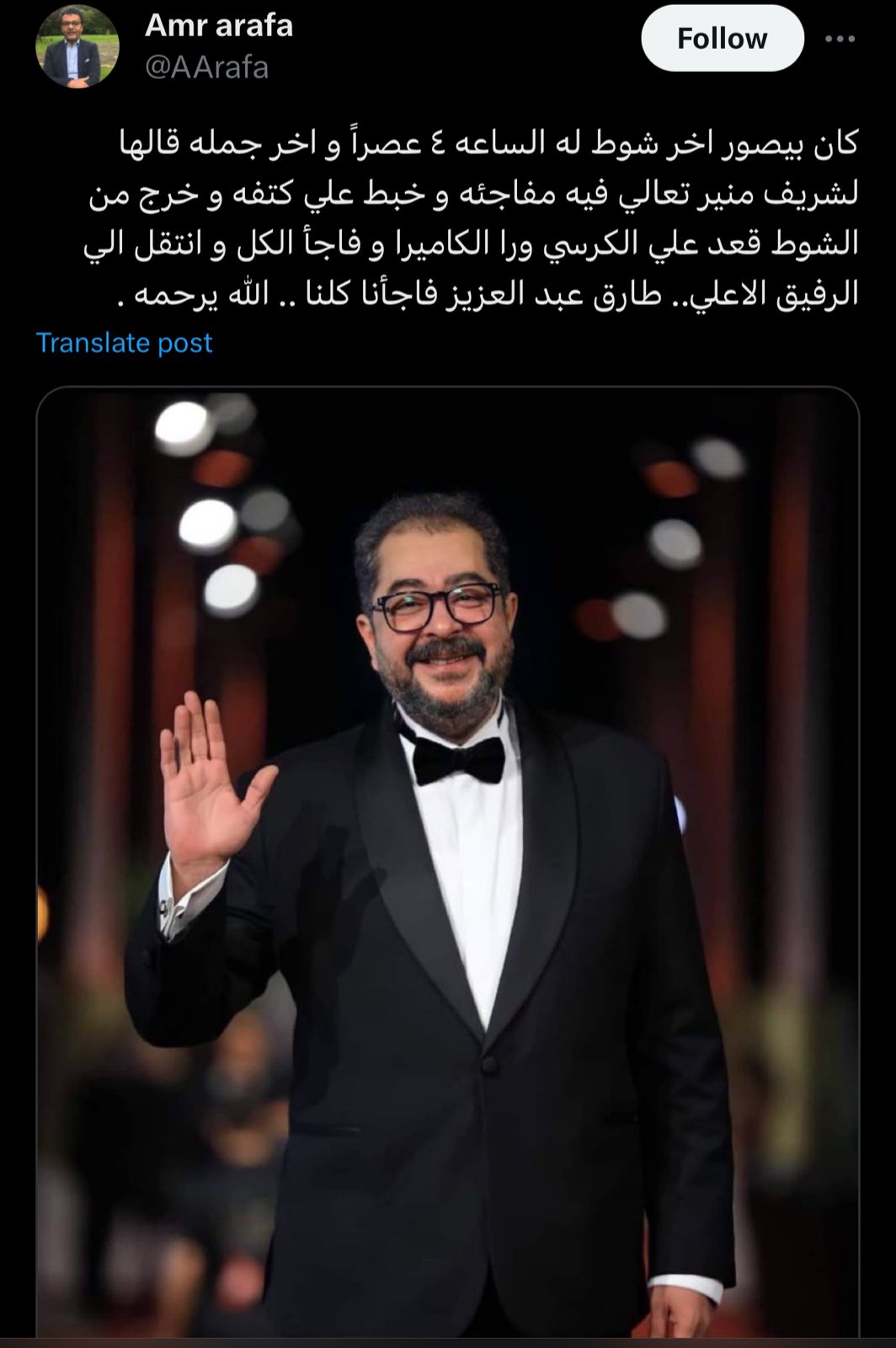 شارك عمرو عرفة، صورة لـ طارق عبد العزيز، عبر حسابه الشخصي بموقع فيسبوك، وعلق عليها قائلًا: كان بيصور أخر شوط له الساعة 4 عصرًا، وأخر جملة قالها لـ شريف منير، تعال فيه مفاجئة، وخبط على كتفه وخرج من الشوط قعد على الكرسي وراء الكاميرا، وفاجأ الكل وانتقل إلى الرفيق الأعلى، طارق عبد العزيز فاجأنا كلنا الله يرحمه.