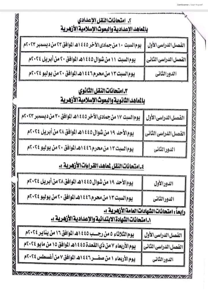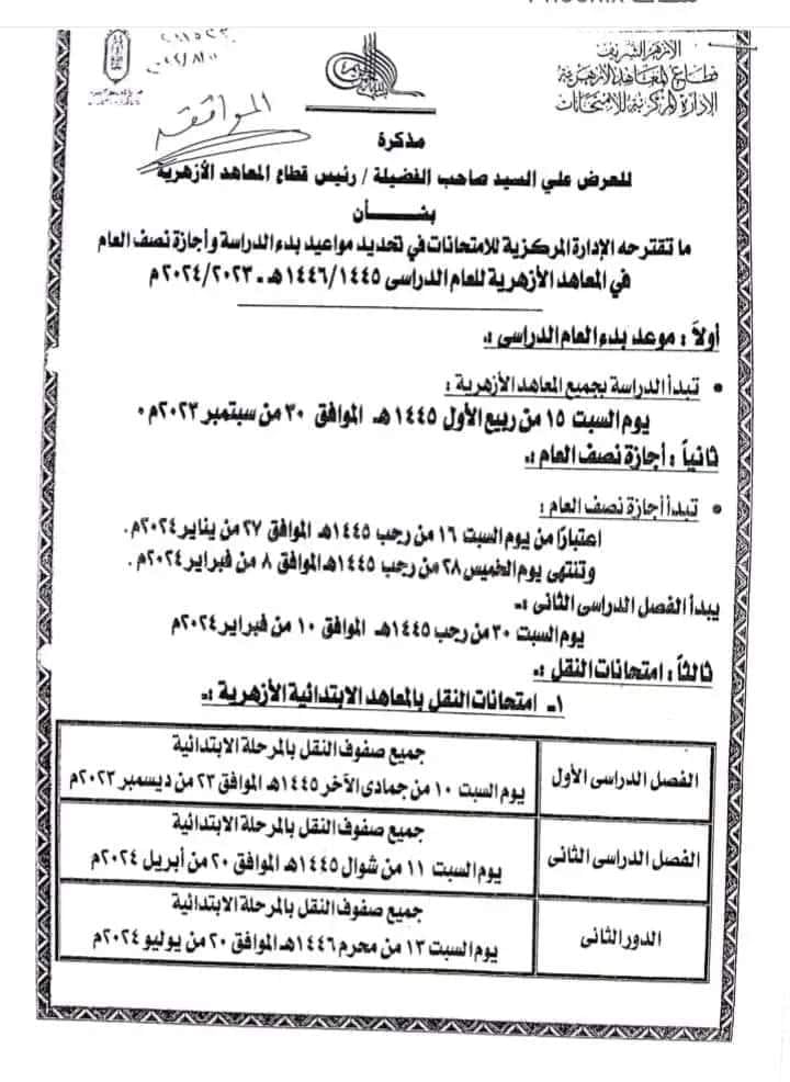 - تبدأ امتحانات الصف الثاني الثانوي الأزهري الترم الأول، يوم السبت 30 ديسمبر المقبل الموافق 17 جمادي ثاني 1445 هجريًا.