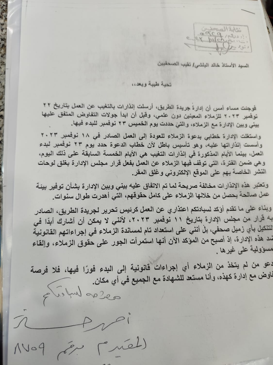 رئيس تحرير جريدة الطريق يخطر نقابة الصحفيين باستقالته بسبب تعنت الإدارة