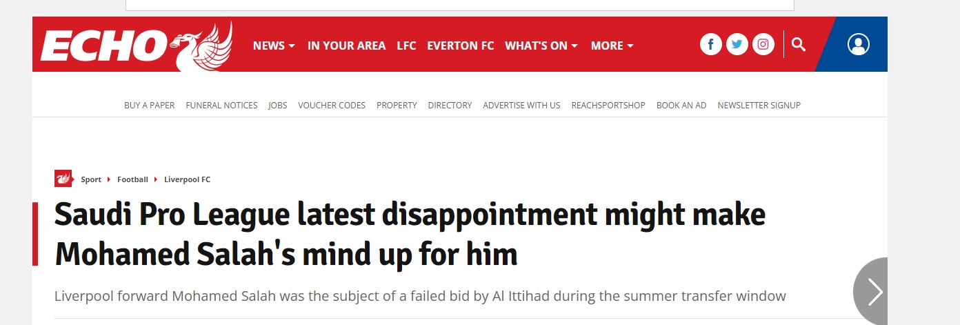 على النقيض تمامًا، كشفت صحيفة ليفربول إيكو، سببا قد يعرقل انتقال محمد صلاح إلى الاتحاد، حيث قالت إن قائد منتخبنا الوطني كان أبرز النجوم المستهدفين، خلال فترة الانتقالات الصيفية الماضية، قبل أن يرفض ليفربول عرضًا ضخمًا بقيمة 150 مليون جنيه إسترليني.