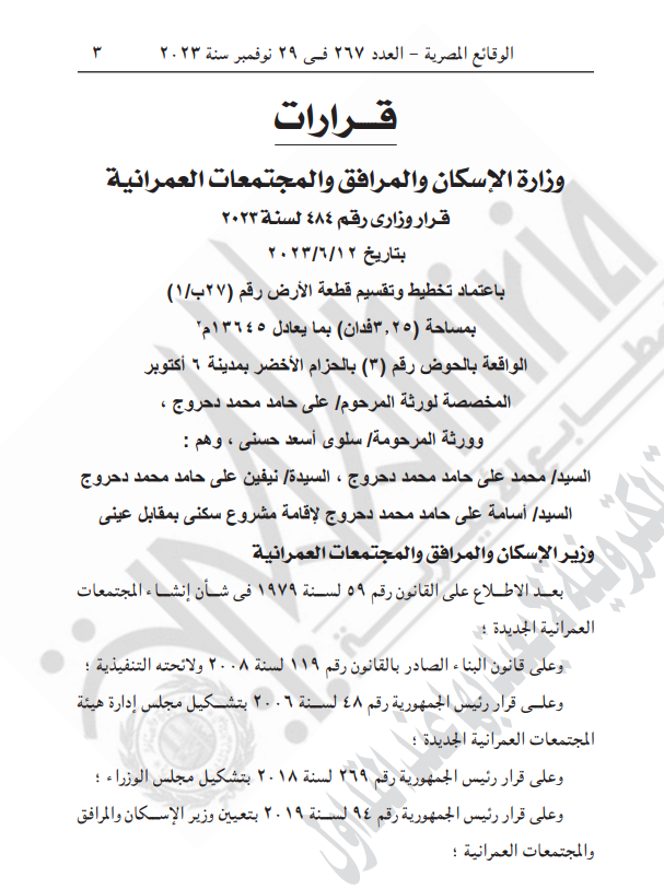 نشرت جريدة الوقائع المصرية قرار وزارة الإسكان والمرافق والمجتمعات العمرانية رقم 484 لسنة 2023 بتاريخ 2023/6/12 باعتماد تخطيط وتقسيم قطعة الأرض رقم 27 ب1/ 2 بمساحة 3.25 فدان بما يعادل 13645م الواقعة بالحوض رقم 3 بالحزام الأخضر بمدينة 6 أكتوبر.