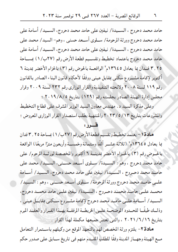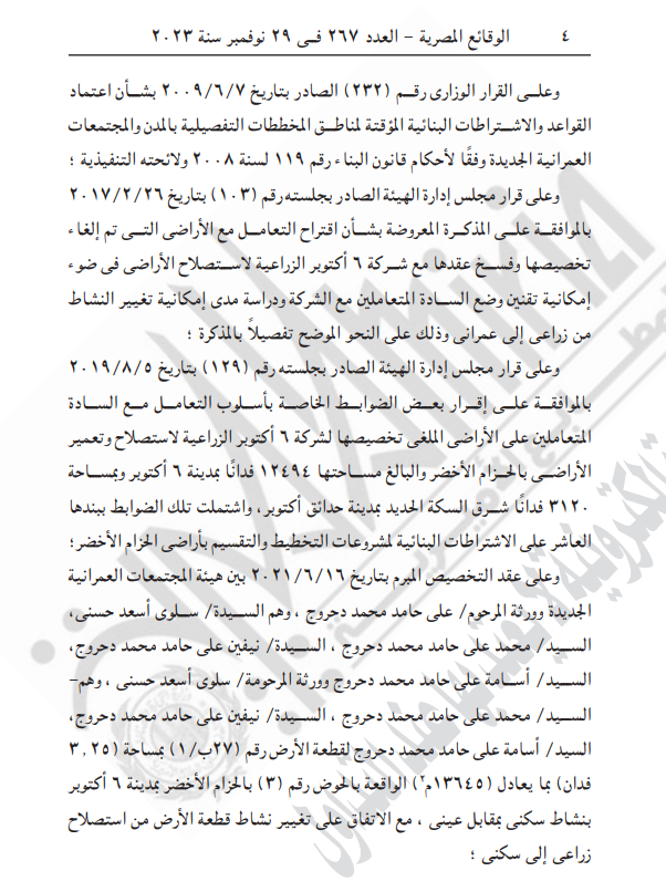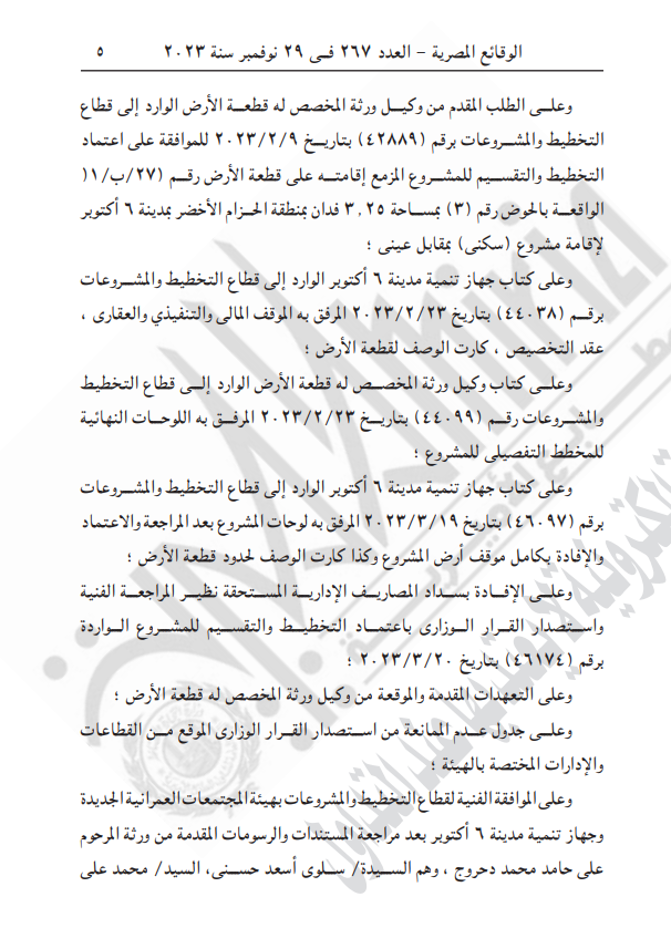الوقائع المصرية تنشر قرار اعتماد تخطيط وتقسيم قطعة أرض على مساحة 3.25 فدان في مدينة 6 أكتوبر