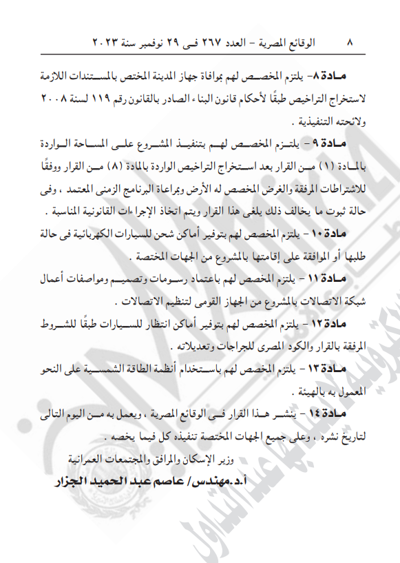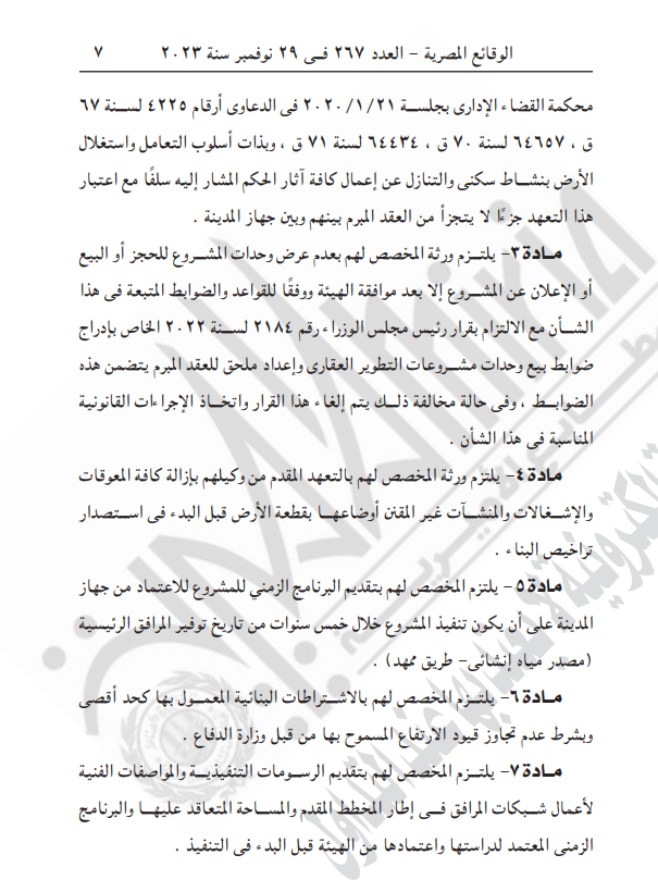 كما نصت المادة الثالثة، أن يلتزم ورثة المخصص لهم بعدم عرض وحدات المشروع للحجز أو البيع أو الإعلان عن المشروع إلا بعد موافقة الهيئة ووفقا للقواعد والضوابط المتبعة في هذا الشأن مع الالتزام بقرار رئيس مجلس الوزراء رقم 2184 لسنة 2022 الخاص بإدراج ضوابط بيع وحدات مشروعات التطوير العقارى وإعداد ملحق للعقد المبرم يتضمن هذه الضوابط، وفي حالة مخالفة ذلك يتم إلغاء هذا القرار واتخاذ الإجراءات القانونية المناسبة في هذا الشأن.
