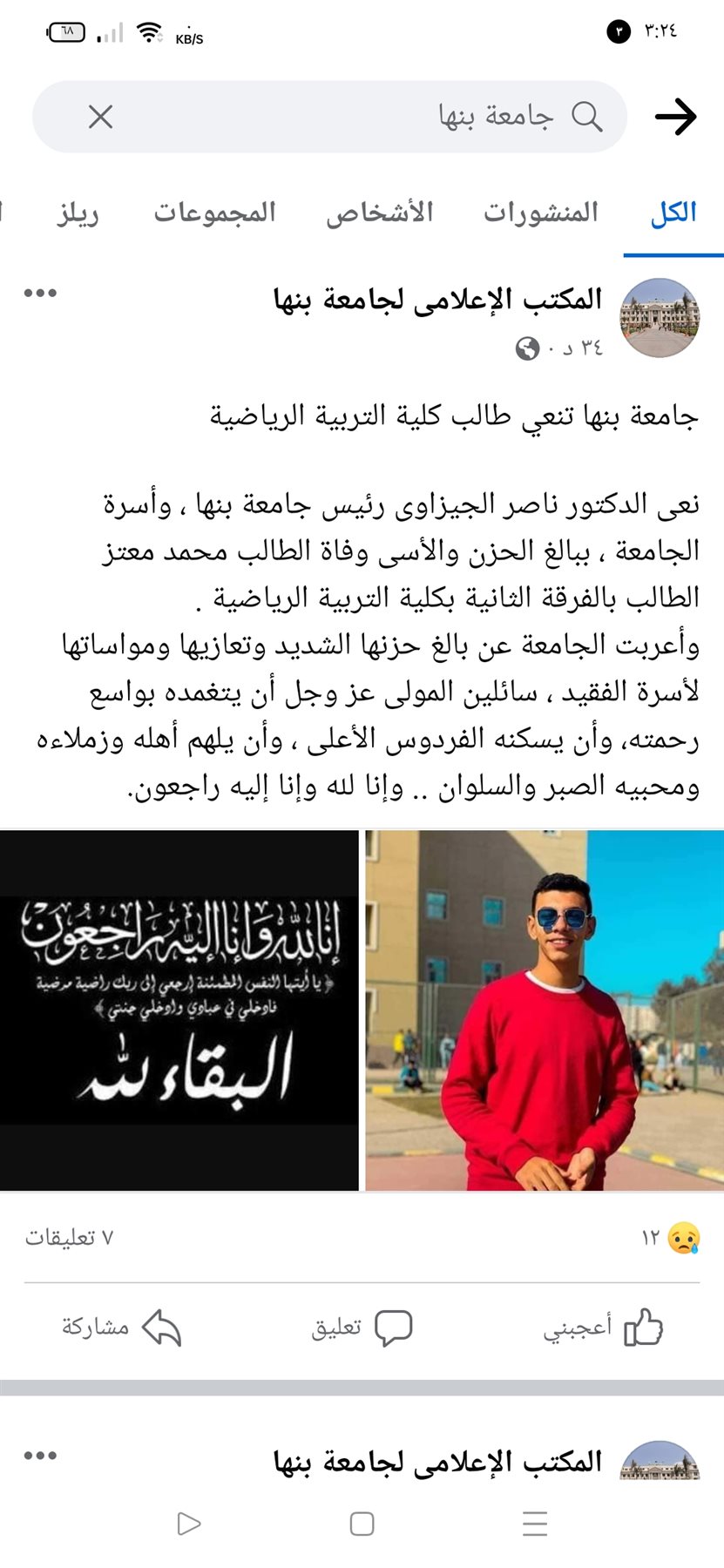 كان رايح التمرين ودهسته سيارة طائشة.. جامعة بنها تنعى طالب كلية التربية الرياضية