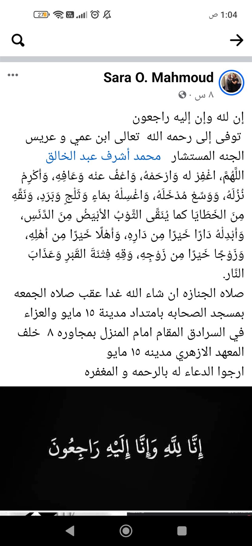 وأضافت أن العزاء سيقام في السرادق المقام أمام المنزل بمجاورة 8 خلف المعهد الأزهري بمدينه 15 مايو.