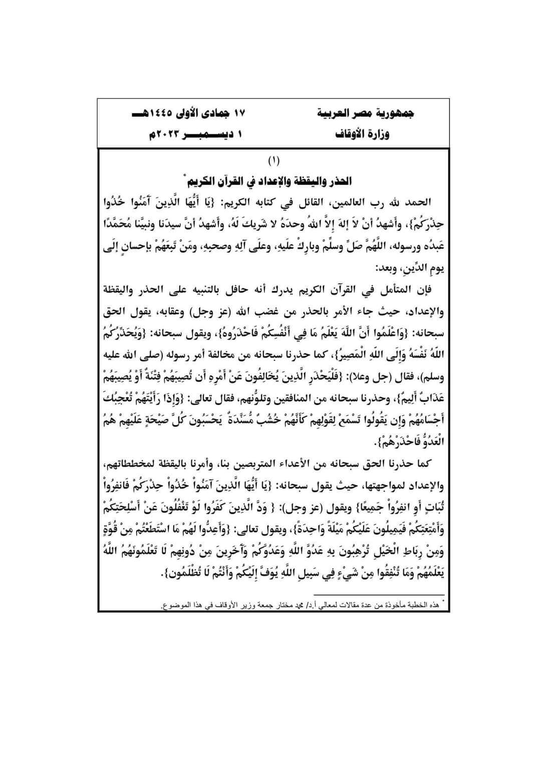 حددت وزارة الأوقاف موضوع خطبة الجمعة اليوم 1 ديسمبر 2023 في جميع مساجد مصر، تحت عنوان الحذر واليقظة والإعداد في القرآن الكريم.