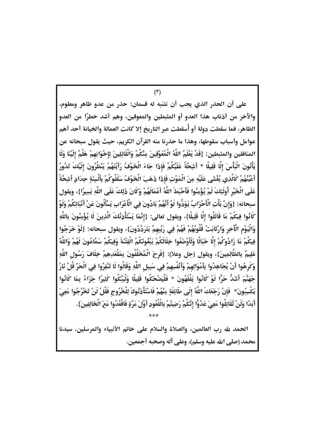 "الحمد لله رب العالمين، القائل في كتابه الكريم: {يَا أَيُّهَا الَّذِينَ آمَنُوا خُذُوا حذركم، وأشهد أن لا إله إلا الله وحدَهُ لا شَريكَ لَهُ، وأشهد أن سيدنا ونبينا مُحَمَّدًا عبده ورسوله، اللهُمَّ صَلِّ وسلم وبارك عليه، وعلى آله وصحبه، ومَنْ تَبِعَهُم بإحسان إلى يوم الدين، وبعد: فإن المتأمل في القرآن الكريم يدرك أنه حافل بالتنبيه على الحذر واليقظة والإعداد، حيث جاء الأمر بالحذر من غضب الله عز وجل وعقابه، يقول الحق سبحانه: {وَاعْلَمُوا أَنَّ اللَّهَ يَعْلَمُ مَا فِي أَنْفُسِكُمْ فَاحْذَرُوهُ، ويقول سبحانه: {وَيُحَذِّرُكُمْ اللهُ نَفْسَهُ وَإِلَى اللهِ الْمَصِيرُ، كما حذرنا سبحانه من مخالفة أمر رسوله صلى الله عليه وسلم)، فقال جل وعلا: {فَلْيَحْذَرِ الَّذِينَ يُخَالِفُونَ عَنْ أَمْرِهِ أَن تُصِيبَهُمْ فِتْنَةٌ أَوْ يُصِيبَهُمْ عَذَابٌ أَلِيمٌ، وحذرنا سبحانه من المنافقين وتلونهم، فقال تعالى: {وَإِذَا رَأَيْتَهُمْ تُعْجِبُكَ أَجْسَامُهُمْ وَإِن يَقُولُوا تَسْمَعْ لِقَوْلِهِمْ كَأَنَّهُمْ خُشُبُ مُسَلَّدَةٌ يَحْسَبُونَ كُلَّ صَيْحَةٍ عَلَيْهِمْ هُمُ الْعَدُوُّ فَاحْذَرْهُمْ.