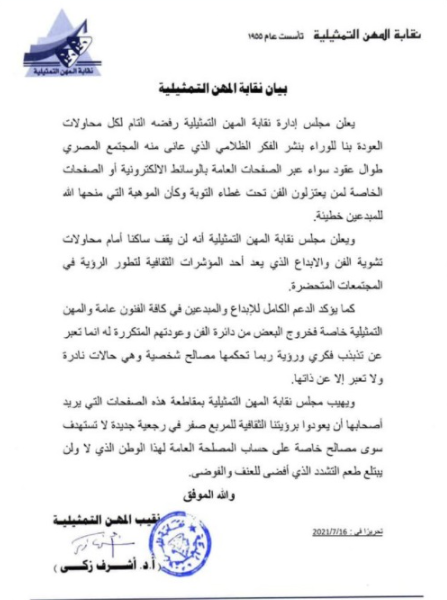 وأكد مجلس نقابة المهن التمثيلية، أنه لن يقف ساكنًا أمام محاولات تشوية الفن والإبداع الذي يعد أحد المؤشرات الثقافية التطور الرؤية في المجتمعات المتحضرة، كما يؤكد الدعم الكامل للإبداع والمبدعين في جميع الفنون عامة والمهن التمثيلية خاصة فخروج البعض من دائرة الفن وعودتهم المتكررة له إنما تعبر عن تذبذب فكري ورؤية ربما تحكمها مصالح شخصية وهي حالات نادرة ولا تعبر إلا عن ذاتها.