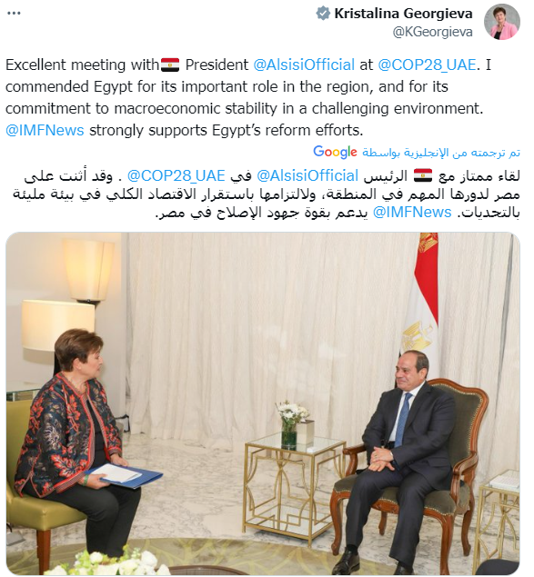 وعبر حسابها على موقع إكس تويتر سابقا قالت چورچييڤا إن مصر لها دور مهم في المنطقة فضلا عن التزامها باستقرار الاقتصاد الكلي في بيئة مليئة بالتحديات مشيرة إلى أن الصندوق يدعم جهود الإصلاح الاقتصادي في مصر واصفة لقائها بالرئيس عبد الفتاح السيسي بأنه ممتاز.