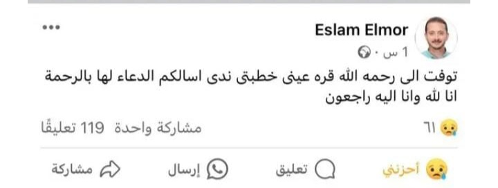 وتبين من تعليقات المستخدمين على فيسبوك أن الفتاة صغيرة في السن وأنها أصيبت بالسرطان قبل فترة، وعانت كثيرا مع المرض، حتى توفيت متأثرة بإصابتها، وكانت من الصابرات على الابتلاء، وأنها كانت قد تم خطبتها قبل عامين من شاب يدعى إسلام المر، ولم يتم تحديد موعد للزفاف نتيجة مرضها الشديد وإصابتها بالسرطان.