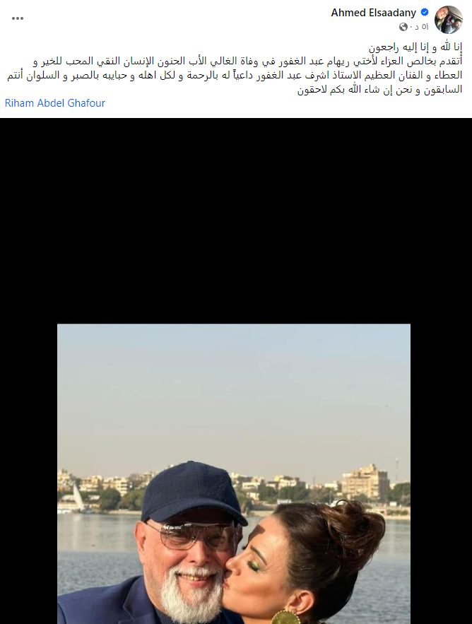 وكتب أحمد السعدني منشورًا، عبر حسابه الشخصي بموقع التواصل الاجتماعي فيس بوك، قال فيه: إنا لله وإنا إليه راجعون، أتقدم بخالص العزاء لأختي ريهام عبد الغفور، في وفاة الغالي الأب الحنون الإنسان النقي، المحب للخير والعطاء والفنان العظيم الأستاذ أشرف عبد الغفور، داعيًا له بالرحمة ولكل أهله وحبايبه بالصبر والسلوان، أنتم السابقون ونحن إن شاء الله بكم لاحقون.