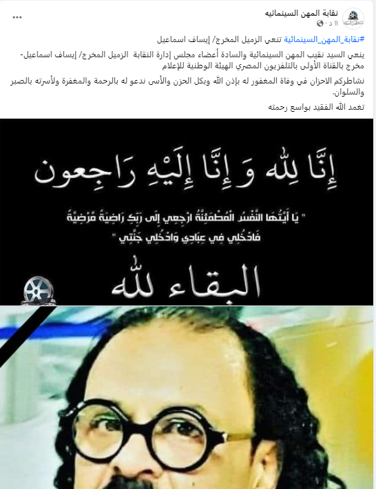 ونص نعي نقابة المهن السينمائية على: ينعى نقيب المهن السينمائية وأعضاء مجلس إدارة النقابة المخرج إيساف إسماعيل مخرج بالقناة الأولى بالتلفزيون المصري التابع للهيئة الوطنية للإعلام، نشاطركم الأحزان في وفاة المغفور له بإذن الله وبكل الحزن والأسى ندعو له بالرحمة والمغفرة ولأسرته بالصبر والسلوان، تغمد الله الفقيد بواسع رحمته.