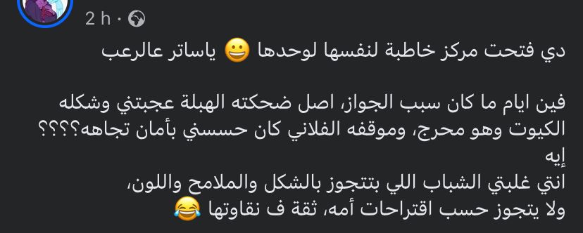 وقالت إحدى الفتيات في منشور لها عبر فيسبوك: في موضوع عبر تويتر عن بنت عاملة قائمة عن ما يقارب الـ 100 وشوية راجل من رجال الأعمال الشباب، وأي حد شغال شغلانة ثقيلة في البلد كاختيار زوج مستقبلي.