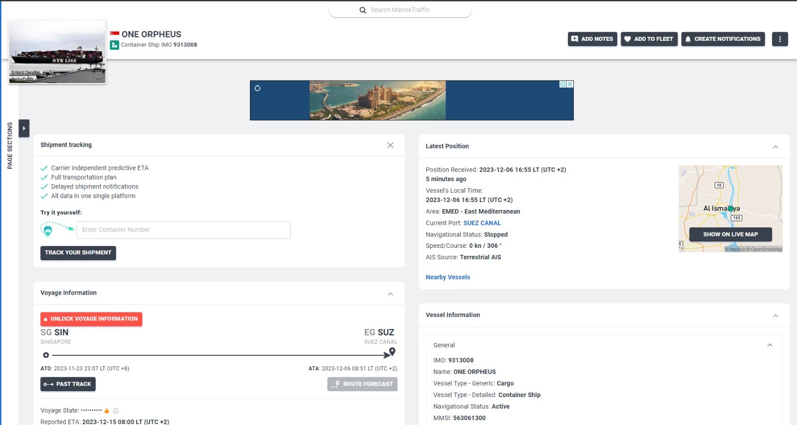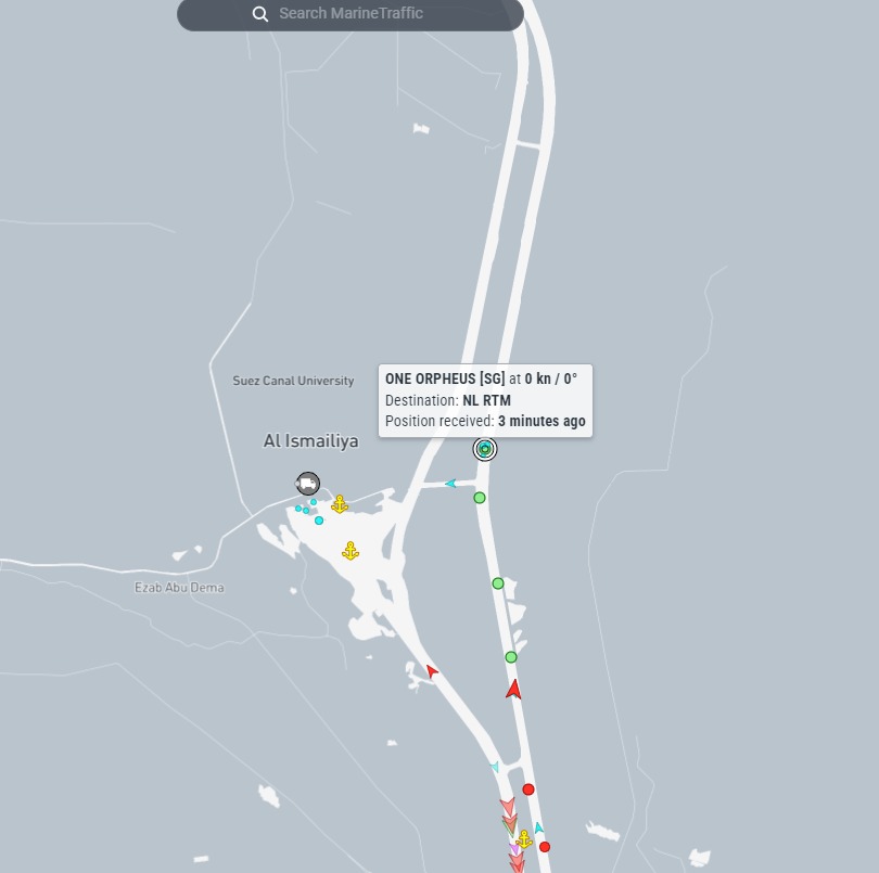 وصرح الفريق أسامة ربيع، رئيس هيئة قناة السويس، بأنه تم الدفع بـ 4 قاطرات لإتمام عملية قطر سفينة الحاويات ONE ORPHEUS بعد فقدانها التوجيه إثر عطل بدفة السفينة أدى إلى اصطدامها بكوبري المنسي، وذلك خلال عبورها للقناة ضمن قافلة الجنوب في رحلتها قادمة من سنغافورة ومتجهة إلى هولندا.