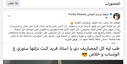 وقال البياضي: حقيقي إحنا شعب دمه خفيف، وعجبتني القلشة، لكن دي فرصة أقول إني فخور بـ فريد وبحملته، لأن الناس اللي بتدعمه مش حيتان ومليارديرات رغم إن فيهم رجال أعمال أغنياء محترمين، لكن الجزء الأكبر هما متطوعين.