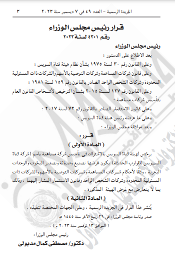 ونص قرار رئيس الوزراء بأن يرخص لهيئة قناة السويس بالاشتراك في تأسيس شركة مساهمة باسم شركة قناة السويس للقوارب الحديثة يكون غرضها تصنيع وصيانة وتصدير اليخوت والوحدات البحرية، وفقًا لأحكام شركات المساهمة وشركات التوصية بالأسهم والشركات ذات المسئولية المحدودة وشركات الشخص الواحد وقانون الاستثمار المشار إليهما، وذلك بما لا يتعارض مع غرض الهيئة المذكورة.