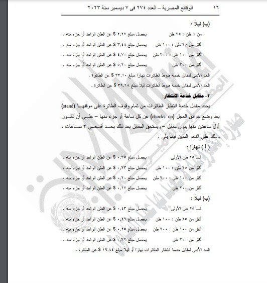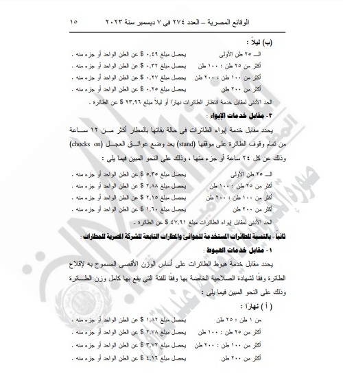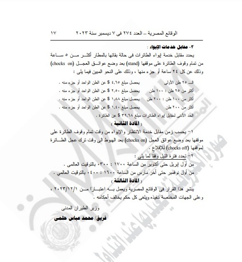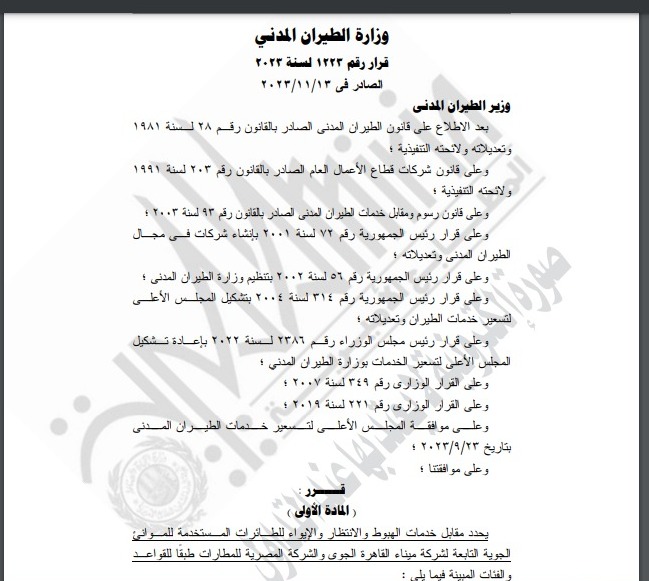 نشرت الجريدة الرسمية قرار وزير الطيران المدني 1223 لسنة 2023 الصادر في 2023/11/13، والخاص بشأن تحديد مقابل خدمات الهبوط والانتظار والإيواء للطائرات المستخدمة للموانئ الجوية التابعة لشركة ميناء القاهرة الجوي والشركة المصرية للمطارات طبقا للقواعد.
