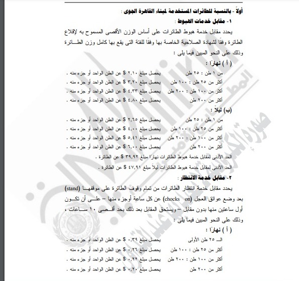 يحدد مقابل خدمات الهبوط والانتظار والإيواء للطائرات المستخدمة للموانئ الجوية التابعة لشركة ميناء القاهرة الجوي والشركة المصرية للمطارات طبقا للقواعد الفئات المبينة فيما يلي:-