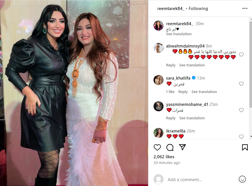 شاركت ريم طارق طليقة مطرب المهرجانات حسن شاكوش، متابعيها صورة لها مع شمس زوجة حمو بيكا من عقيقة ابنتهما أمس، واكتفت ريم بنشر الصورة عبر حسابها بموقع تبادل الصور والفيديوهات إنستجرام، مع تعليق: أم تاج.
