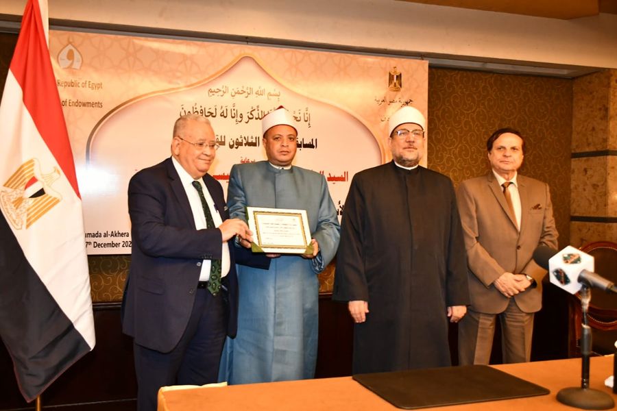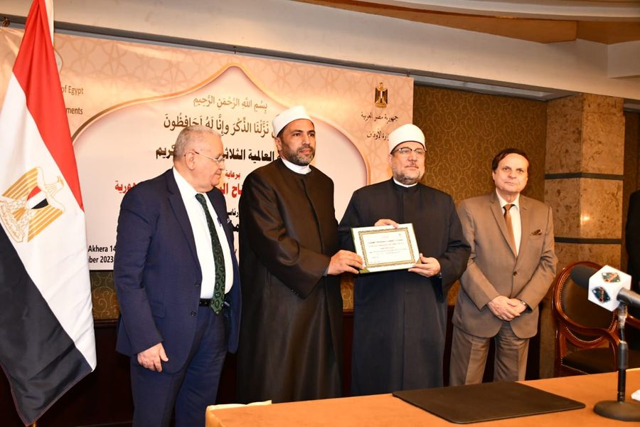 كرَّم الدكتور محمد مختار جمعة وزير الأوقاف مراكز إعداد محفظي القرآن الكريم الحاصلة على المراكز الثلاثة الأولى في مسابقة القرآن الكريم عن العام الدراسي 2023/ 2024، على هامش المؤتمر الصحفي التحضيري الثاني للمسابقة العالمية الثلاثين للقرآن الكريم بفندق جراند نايل تاور اليوم السبت 9/ 12/ 2023.