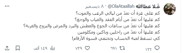 وتساءلت الصحفية علا عطا الله في آخر منشور لها على موقع التواصل الاجتماعي X، عن طول أيام القصف الإسرائيلي على قطاع غزة قائلة: "كم على غزة أن تعدّ من ليالي الرعب والموت؟.. كم عليها أن تعدّ من أيام الفقد والغياب والوجع؟.. كم عليها أن تعدّ من ساعات الجوع والعطش والبرد والمرض والنزوح والغربة؟.. كم عليها أن تعدّ من راحلين وباكين ومكلومين.. كي تسقط لعنة الحساب وتختفي قسوة الأرقام!".