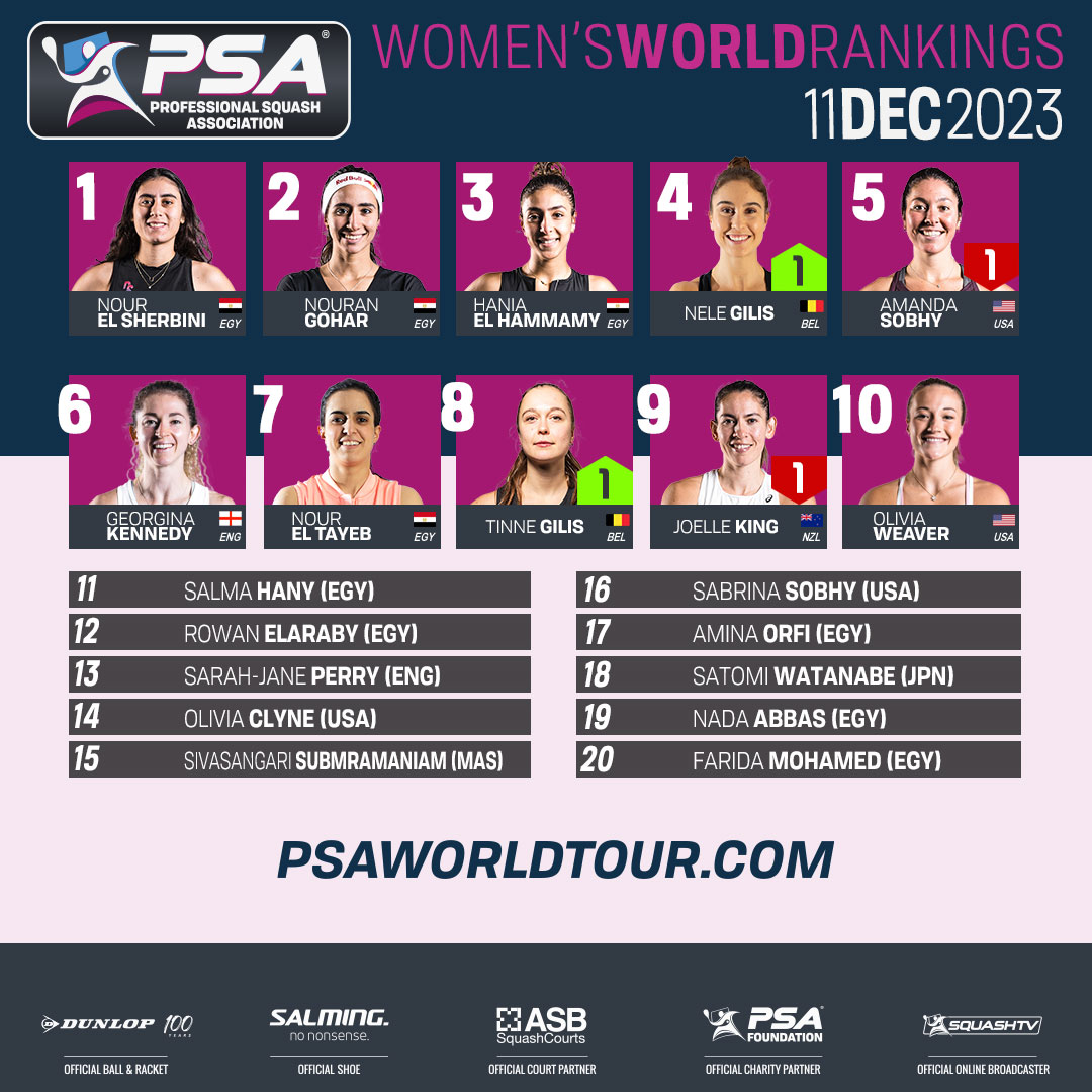 في السياق ذاته، واصلت البطلة المصرية نور الشربيني صدارة تصنيف السيدات، في حين استمرت مواطنتها نوران جوهر في المركز الثاني ثم هانيا الحمامي في المركز الثالث، رغم فوزها بلقب بطولة هونج كونج للاسكواش.