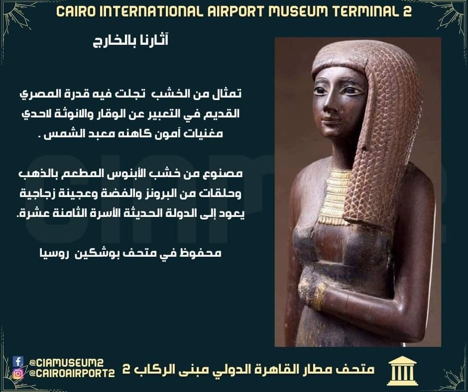 وقالت إدارة قطاع المتاحف بوزارة السياحة والآثار، في بيان لها، إن التمثال من الخشب وتجلت فيه قدرة المصري القديم في التعبير عن الوقار والأنوثة لإحدى مغنيات آمون كاهنه معبد الشمس، مصنوع من خشب الأبنوس المطعم بالذهب وحلقات من البرونز، والفضة، وعجينة زجاجية، يعود إلى الدولة الحديثة الأسرة الثامنة عشرة.