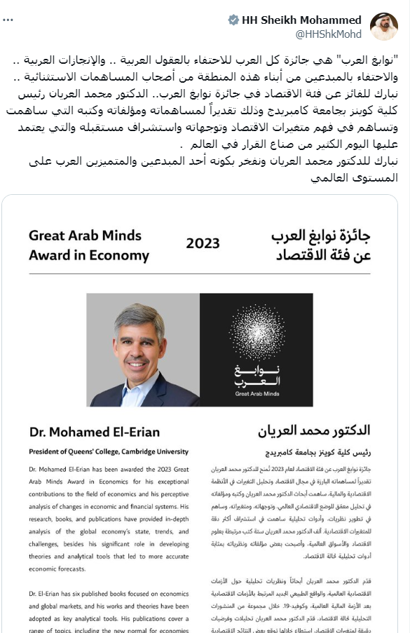 وتابع: نبارك للفائز عن فئة الاقتصاد في جائزة نوابغ العرب.. الدكتور محمد العريان رئيس كلية كوينز بجامعة كامبريدج، وذلك تقديرًا لمساهماته ومؤلفاته وكتبه التي ساهمت وتساهم في فهم متغيرات الاقتصاد وتوجهاته واستشراف مستقبله، والتي يعتمد عليها اليوم الكثير من صناع القرار في العالم.