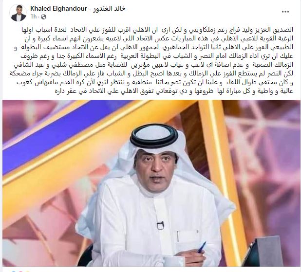 وقال الغندور في منشور عبر حسابه على فيسبوك: الصديق العزيز وليد الفراج رغم زملكاويتي ولكن أرى أن الأهلي أقرب للفوز على الاتحاد لعدة أسباب، أولها الرغبة القوية للاعبي الأهلي في هذه المباريات عكس الاتحاد، اللي لاعبيه يشعرون أنهم أسماء كبيرة، وأن الطبيعي الفوز على الأهلي.