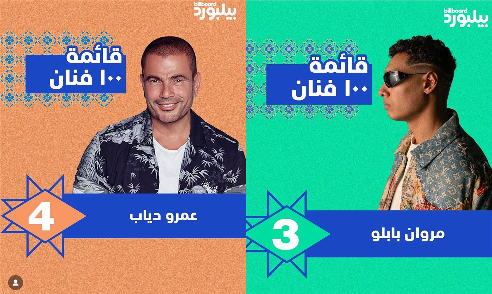 وسبق مطرب الراب المصري مروان بابلو، عمرو دياب في ترتيب أفضل 10 فنانيين في هذا الأسبوع بقائمة بيلبورد عربية، حيث احتل بابلو المرتبة الثالثة وحل الهضبة في المرتبة الرابعة.