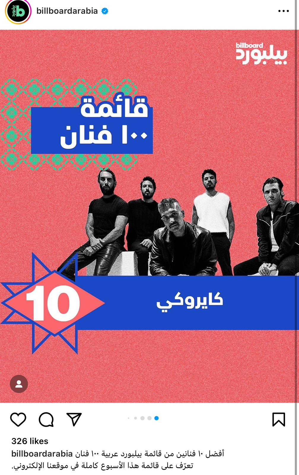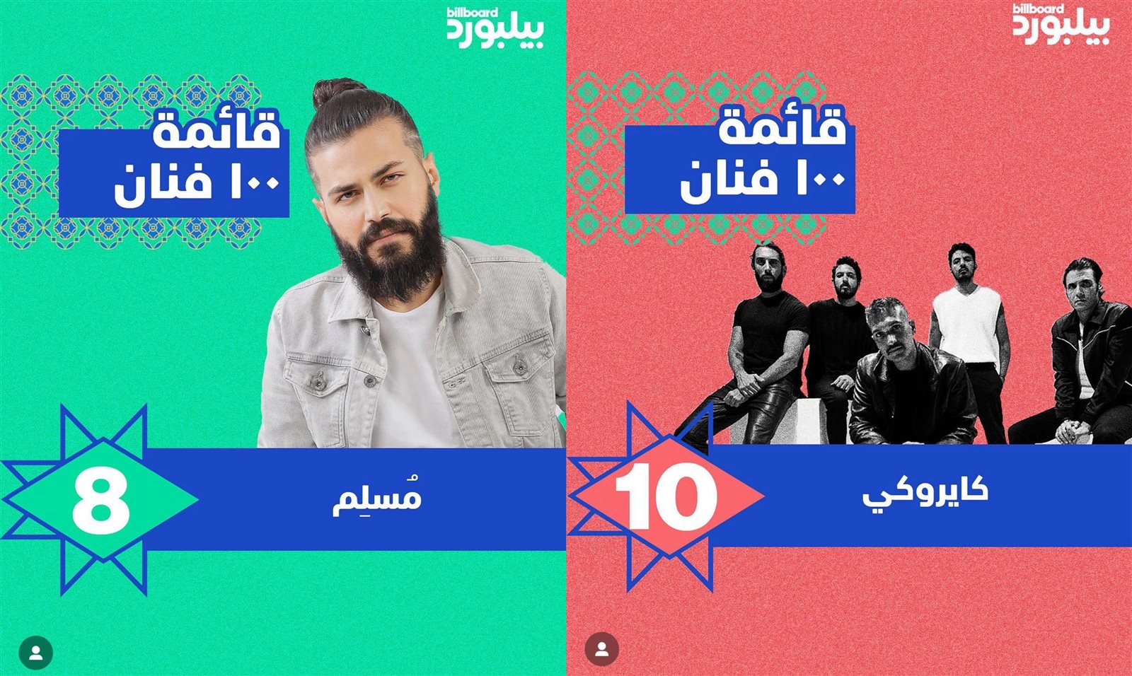 بينما احتل المطرب السعودي عايض، المرتبة التاسعة، وختمت فرقة كايروكي ترتيب أفضل 10 فنانين في قائمة بيلبورد عربية هذا الأسبوع، ضمن قائمة 100 فنان.