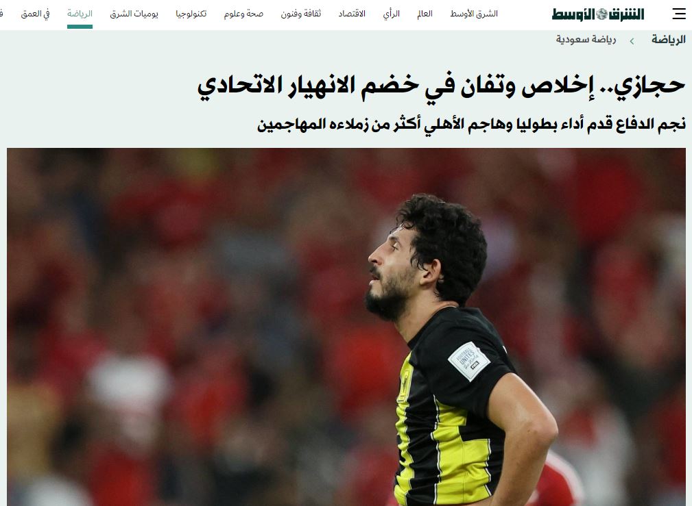 أشادت صحيفة الرياضية السعودية، بأداء أحمد حجازي مدافع اتحاد جدة، أمام الأهلي في المباراة التي انتهت بفوز المارد الأحمر بنتيجة 3-1 في ربع نهائي كأس العالم للأندية.