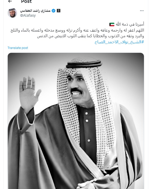 أعلن القارئ والمنشد الكويتي مشاري راشد العفاسي، وفاة أمير الكويت نواف الأحمد الجابر الصباح، عن عمر ناهز الـ 86 عاما.